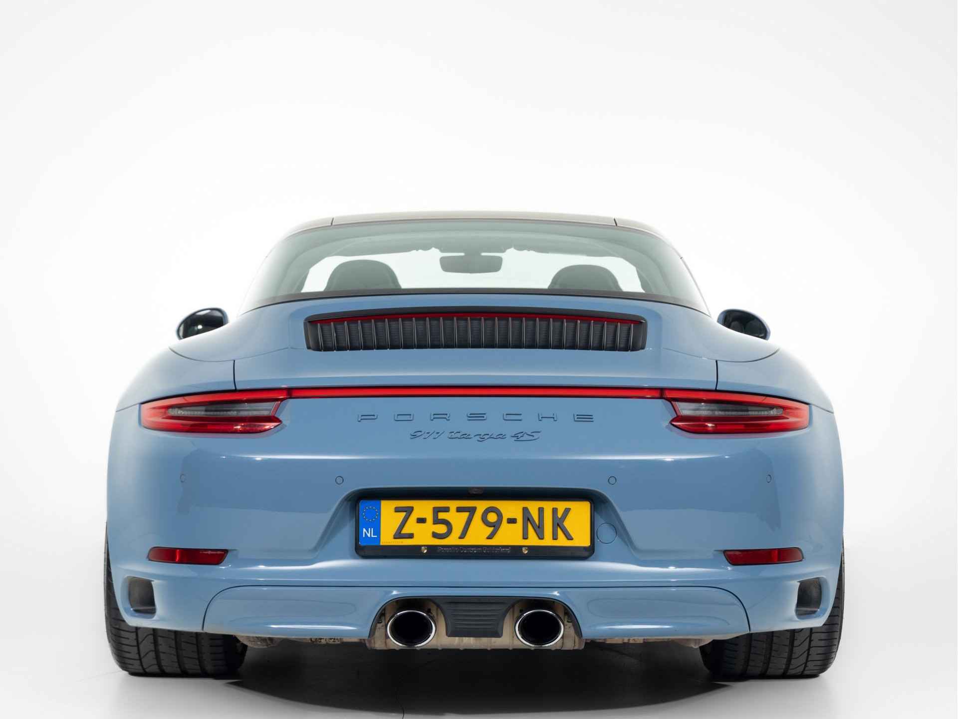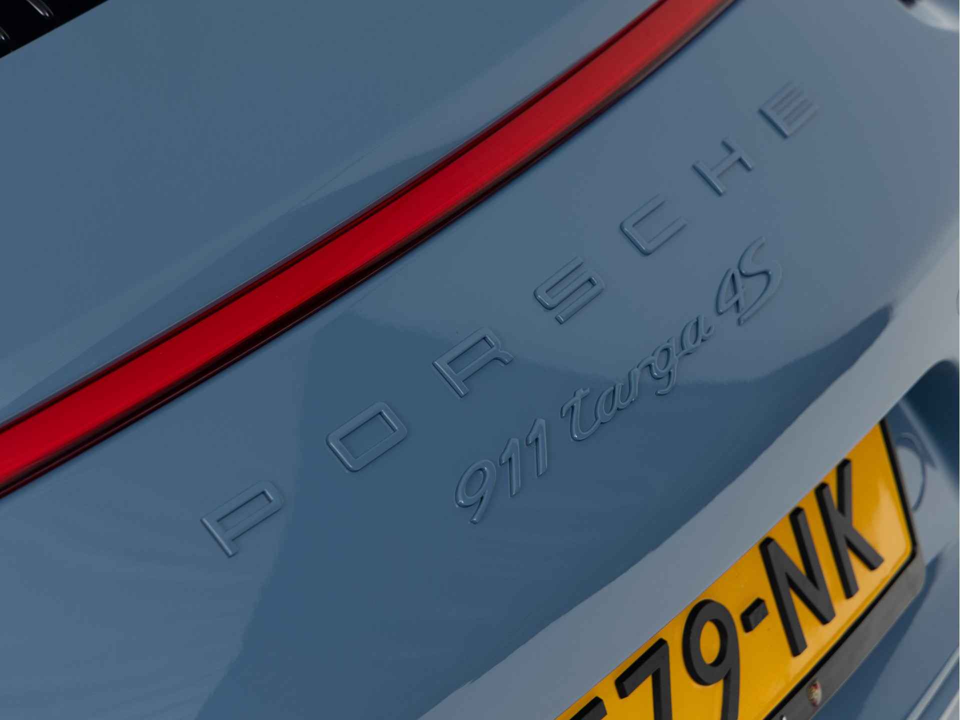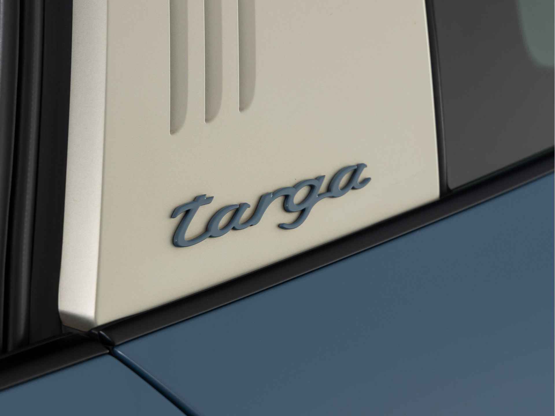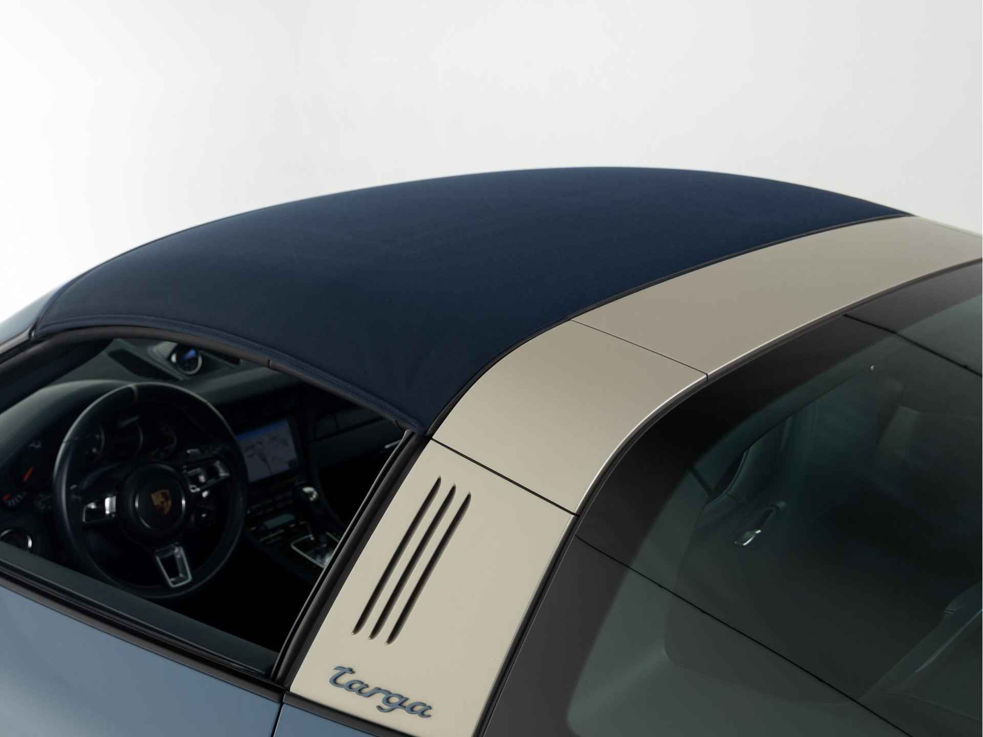 De unieke kleur Etnablauw van de Porsche 911 Targa 4S Exclusive Design is ook terug te vinden op de voorspoiler, het onderste gedeelte van de achterbumper, de typeaanduiding achter, de afdekkapjes van de koplampsproeiers en het Targa-logo op de kenmerkende beugel. De Targa-beugel zelf, de 20 inch RS Spyder-wielen en de Porsche-logo’s op de flanken van de Targa zijn uitgevoerd in zijdeglans witgoud metallic. De limited edition is standaard uitgevoerd met zwart getinte led-koplampen inclusief Porsche Dynamic Light System Plus (PDLS Plus)