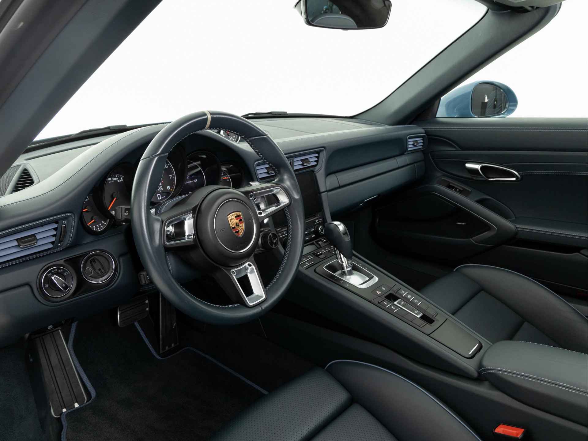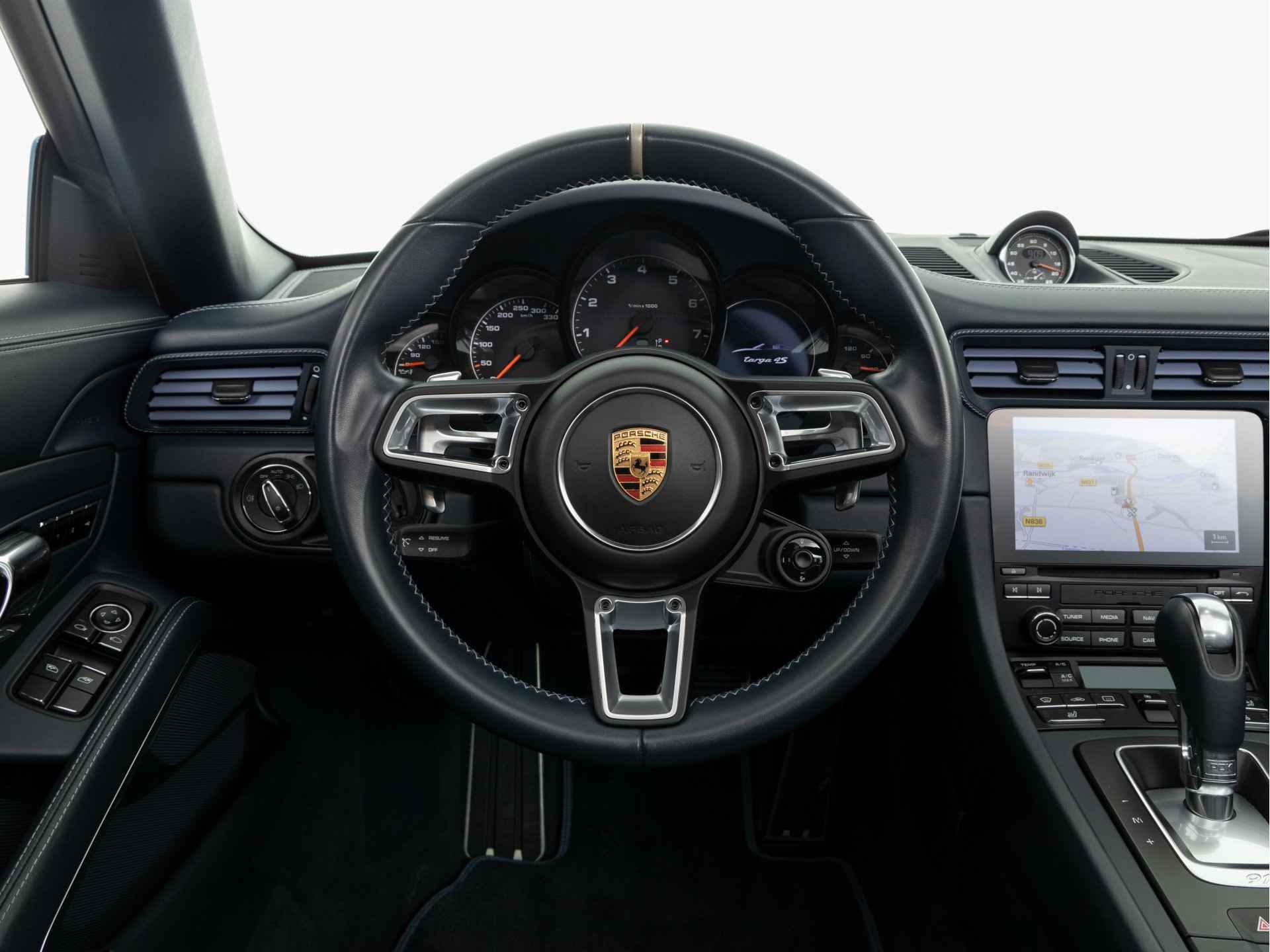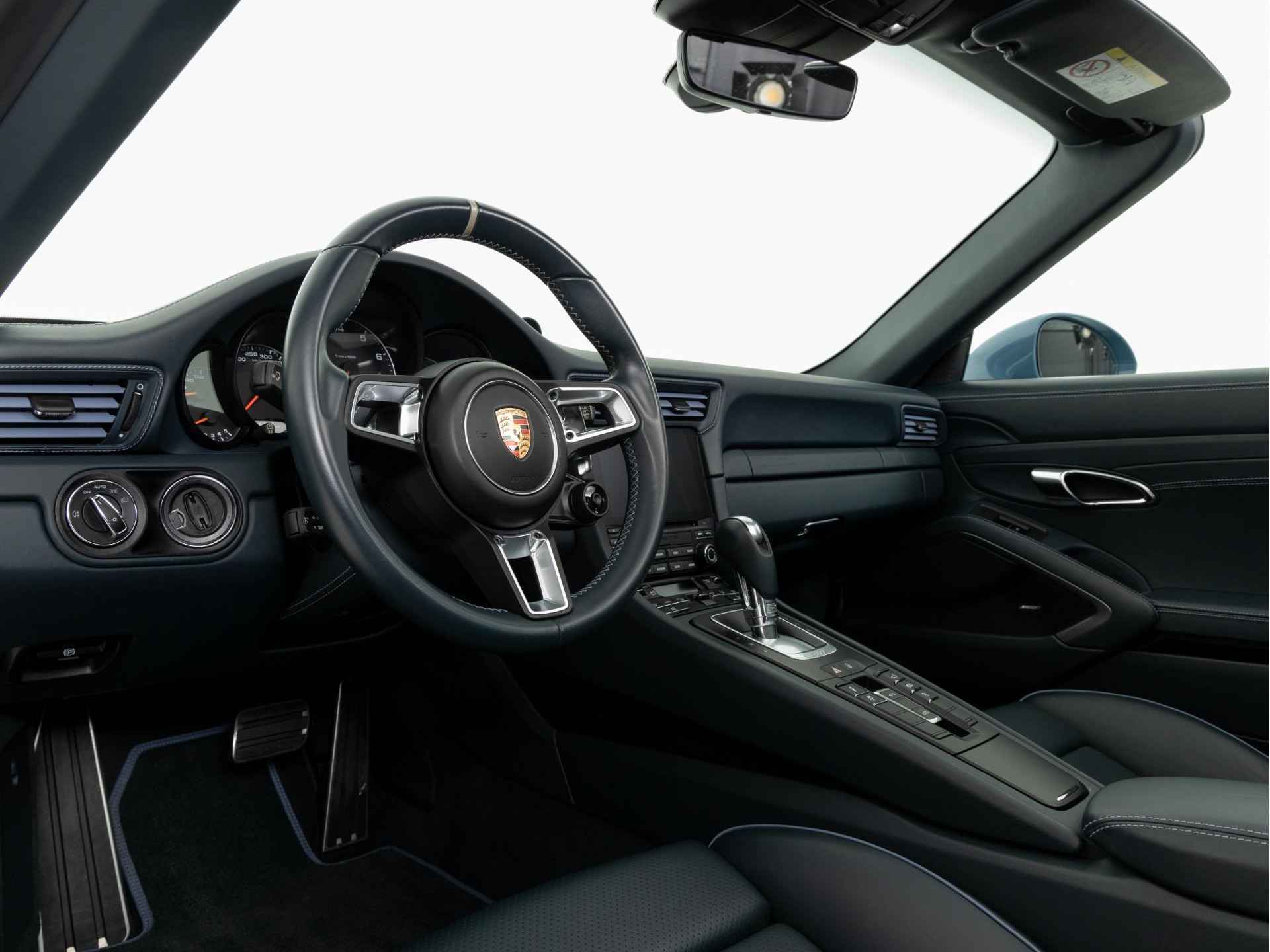 Porsche Exclusive is de afdeling die exclusieve Porsches nog exclusiever maakt. Dat gaat ook op voor de nieuwe 911 Targa 4S Exclusive Design Edition. Met liefde voor het detail is de speciale versie van de Targa in Zuffenhausen verder verfijnd. Het exclusieve karakter komt onder meer tot uitdrukking in het interieur. De instaplijsten zijn in zwart geanodiseerd aluminium uitgevoerd en dragen de 911 Targa 4S Exclusive Design Edition-aanduiding die blauw is verlicht. Het interieur is met inbegrip van de achttienvoudig verstelbare Adaptieve sportstoelen Plus bekleed met grafietblauw leder. Het Porsche logo is in de hoofdsteunen geperst. Alle lederstiksels, de lamellen van de luchtuitstroomopeningen en de biezen van de matten zijn uitgevoerd in Provenceblauw. De afzender wordt duidelijk gemaakt door het deksel van de middenarmsteun met de aanduiding ‘Porsche Exclusive Manufaktur’.