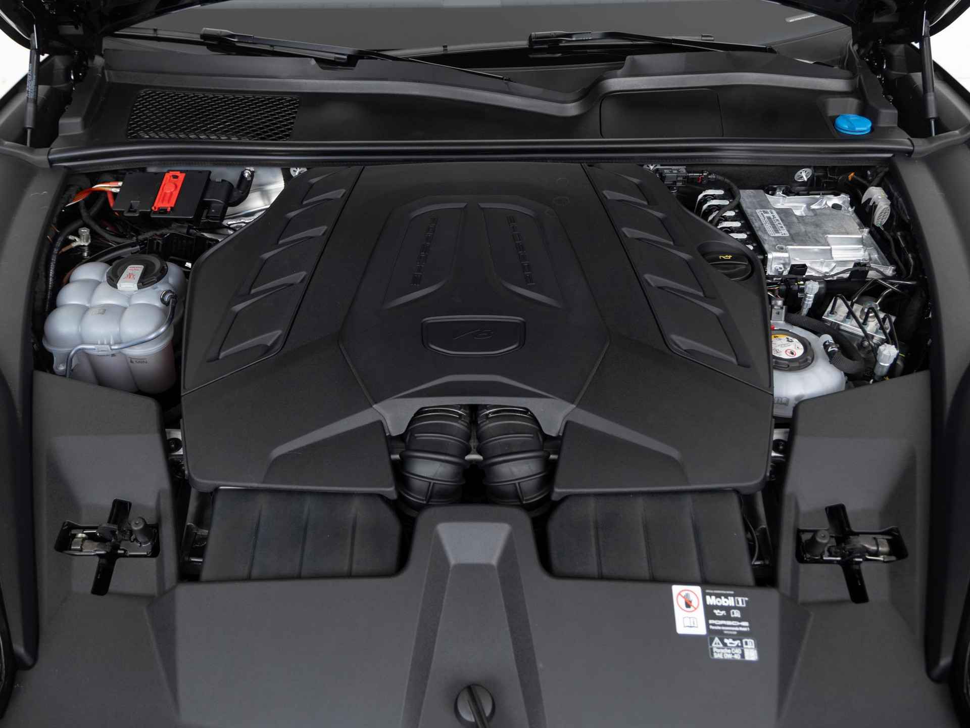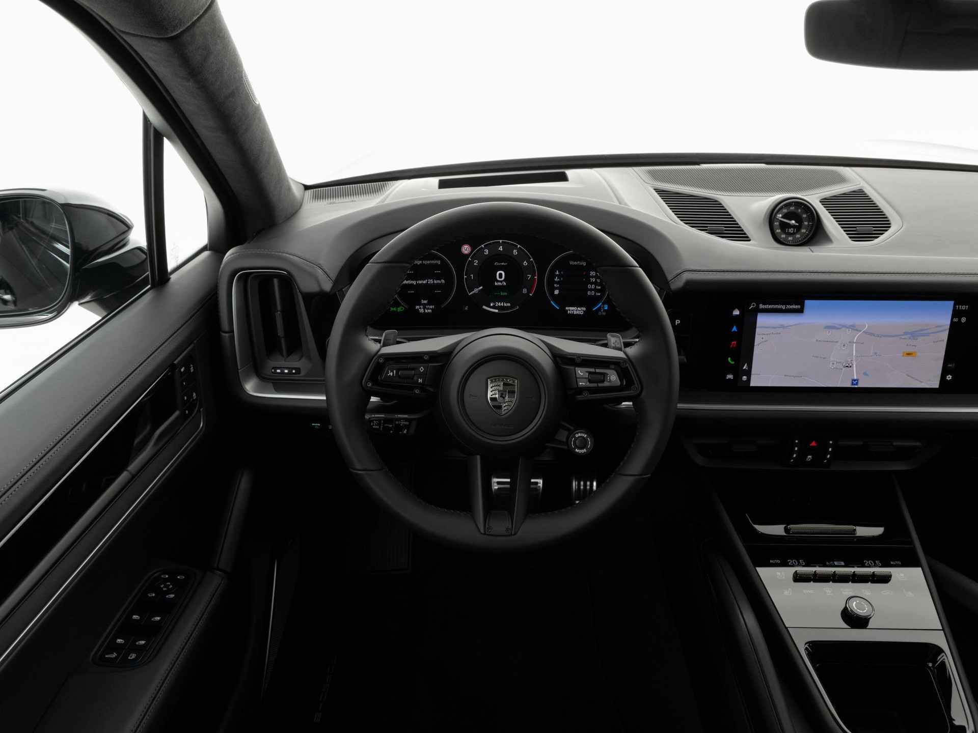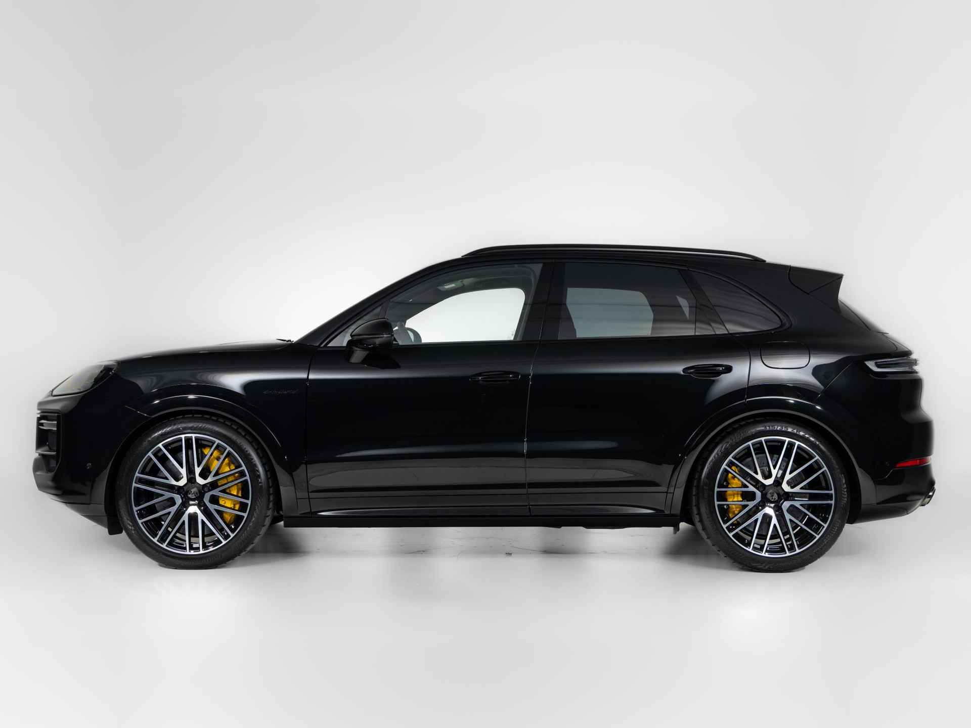 Deze Porsche Cayenne Turbo E-Hybrid in de kleur Chromite zwart metallic is nog nieuw en ongeregistreerd. De Porsche onderscheidt zich onder andere door unieke opties, zoals; Bekleding stuurkolom leder, Getinte HD-Matrix LED-koplampen, Porsche Dynamic Chassis Control (PDCC) en Porsche keramisch composiet remsysteem (PCCB), gele remklauwen. Uiteraard is dit exemplaar nog verder te verfraaien door hoogwaardige accessoires van Porsche Tequipement.